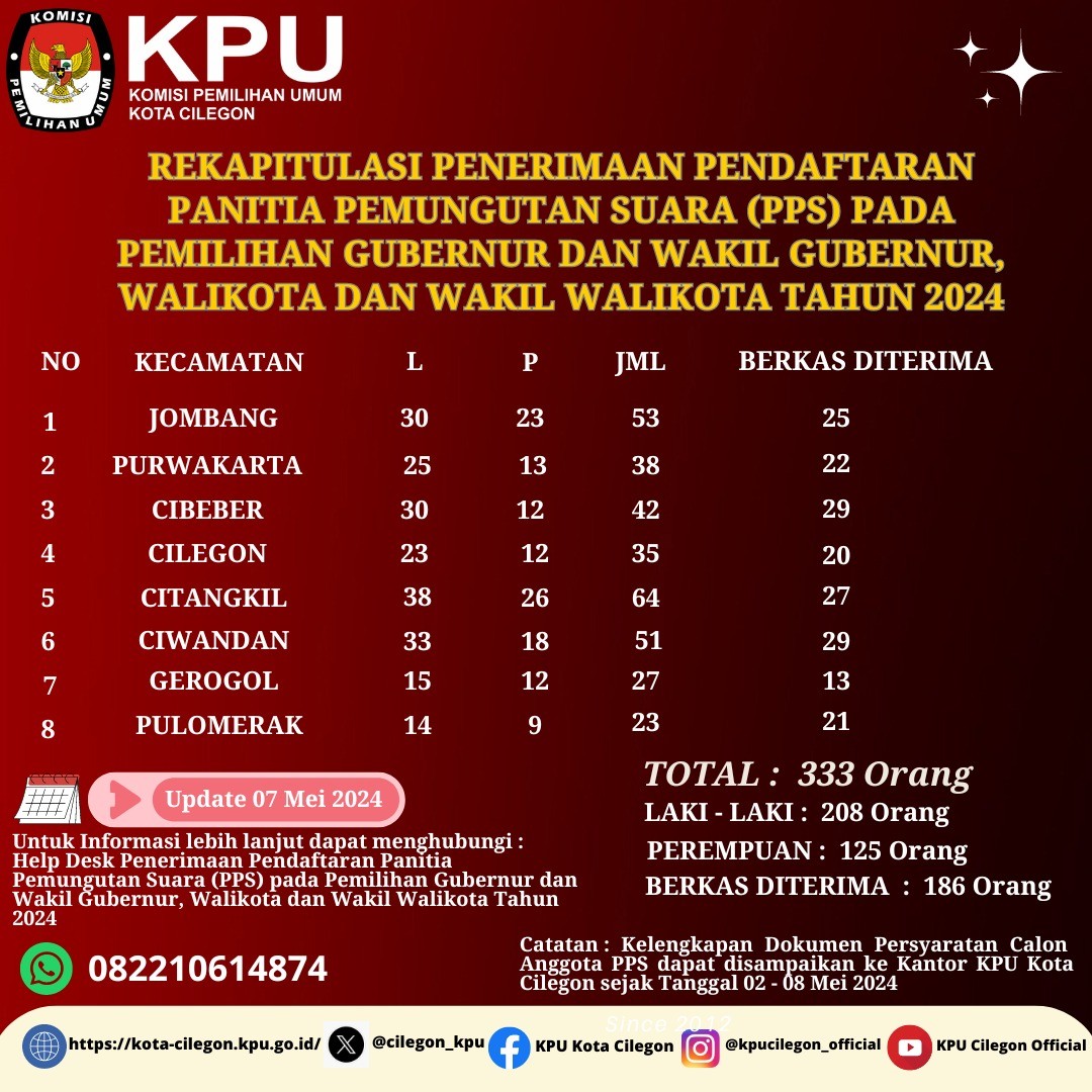 Rekapitulasi Penerimaan Pendaftaran PPS pada Pemilihan Gubernur dan Wakil Gubernur, Walikota dan Wakil Walikota Kota Cilegon Tahun 2024   Berikut disampaikan rekap pendaftar PPS se-Kota Cilegon per tanggal 07 Mei 2024 Untuk Informasi lebih lanjut dapat menghubungi : Help Desk Penerimaan Pendaftaran Panitia Pemungutan Suara (PPS) pada Pemilihan Gubernur dan Wakil Gubernur, Walikota dan Wakil Walikota Kota Cilegon Tahun 2024 (082210614874) Catatan : Kelengkapan dokumen persyaratan Calon Anggota PPS dapat disampaikan ke Kantor  KPU Kota Cilegon pada tanggal 02 - 08 Mei 2024.