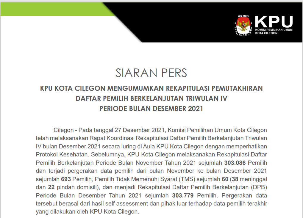 Dalam Rapat Koordinasi tersebut Ketua KPU Kota Cilegon, yaitu Bapak Irfan Alfi, S.Ag, M.H. menetapkan hasil Rekapitulasi DPB Triwulan IV bulan Desember tahun 2021 yaitu sebanyak 303.779 dengan pemilih laki-laki sebanyak 152.478 dan pemilih perempuan sebanyak 151.301. Potensi pemilih baru sebanyak 753 pemilih, dan pemilih kategori Tidak Memenuhi Syarat (TMS) sebanyak 60 pemilih. Tentunya, data pemilih yang terus diperbaharui tersebut telah dilakukan verifikasi sebelumnya dengan pihak Disdukcapil Kota Cilegon.