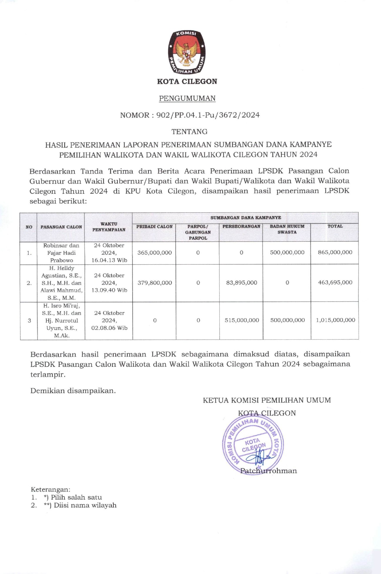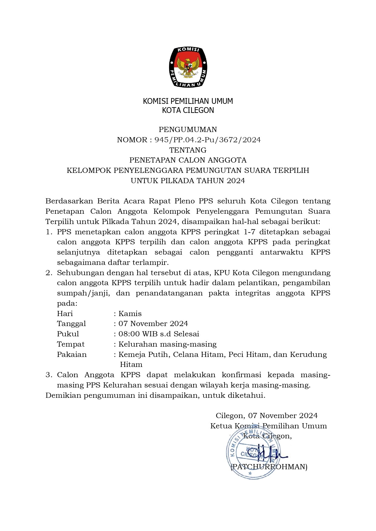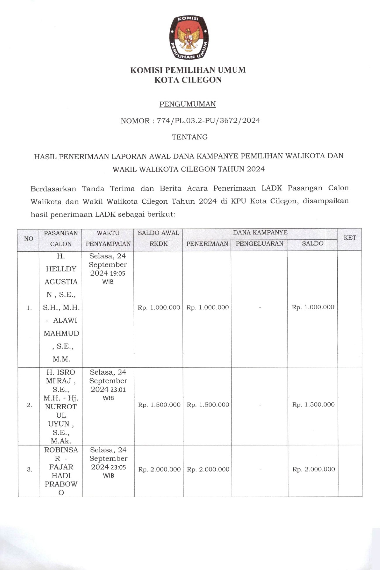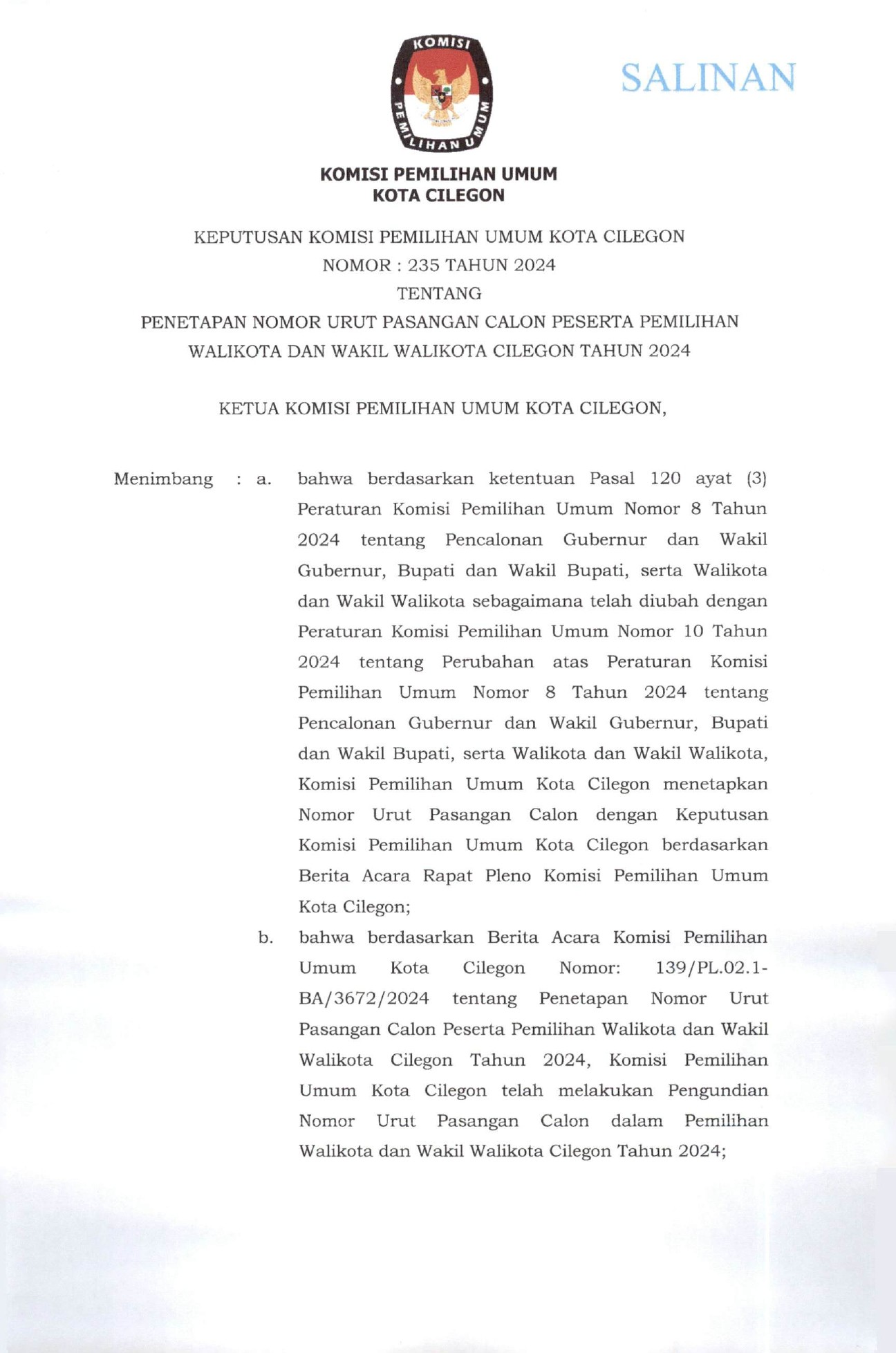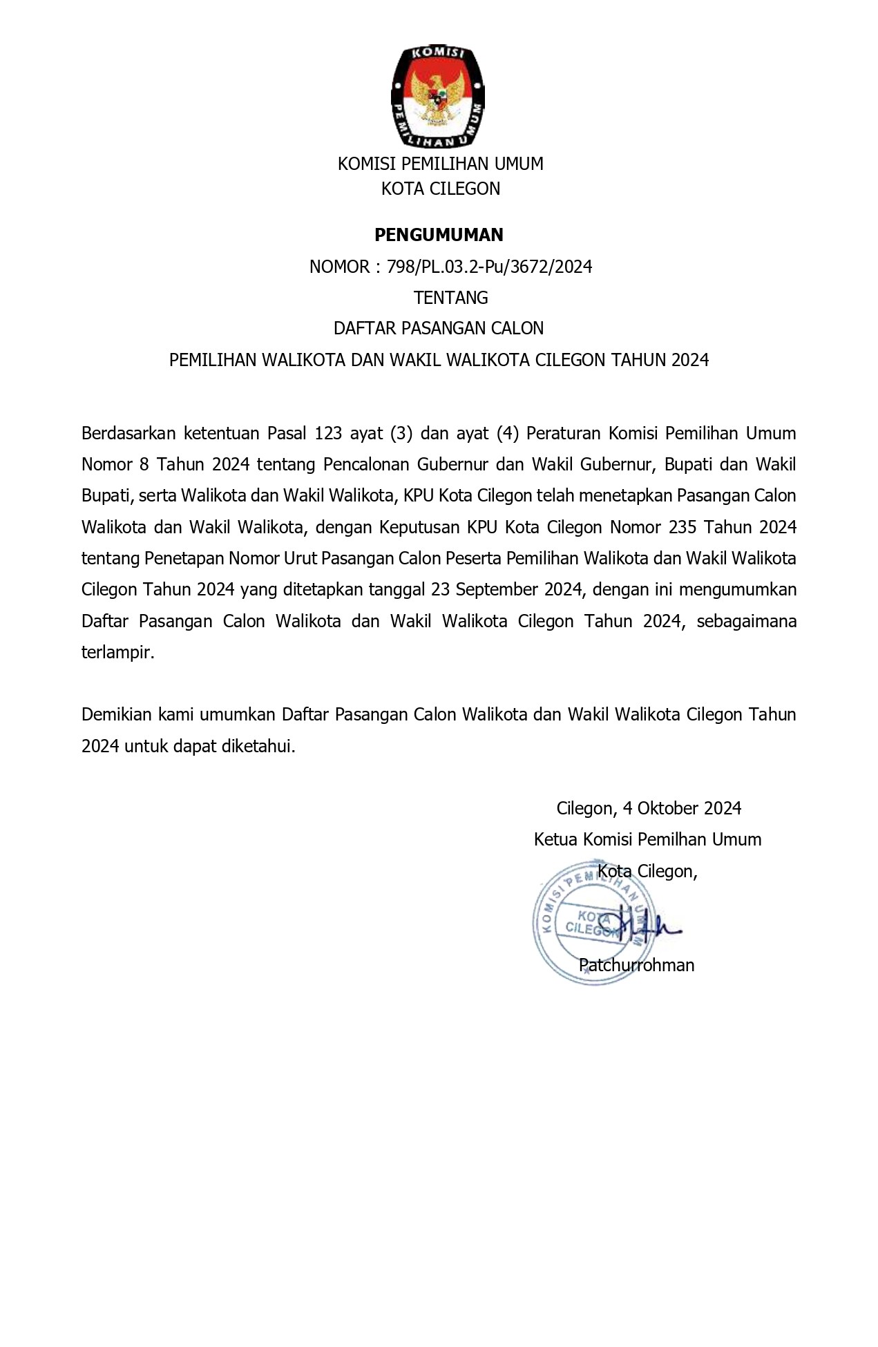 Berdasarkan ketentuan Pasal 123 ayat (3) dan ayat (4) Peraturan Komisi Pemilihan Umum Nomor 8 Tahun 2024 tentang Pencalonan Gubernur dan Wakil Gubernur, Bupati dan Wakil Bupati, serta Walikota dan Wakil Walikota, KPU Kota Cilegon telah menetapkan Pasangan Calon Walikota dan Wakil Walikota, dengan Keputusan KPU Kota Cilegon Nomor 235 Tahun 2024 tentang Penetapan Nomor Urut Pasangan Calon Peserta Pemilihan Walikota dan Wakil Walikota Cilegon Tahun 2024 yang ditetapkan tanggal 23 September 2024, dengan ini mengumumkan Daftar Pasangan Calon Walikota dan Wakil Walikota Cilegon Tahun 2024, sebagaimana link terlampir.
