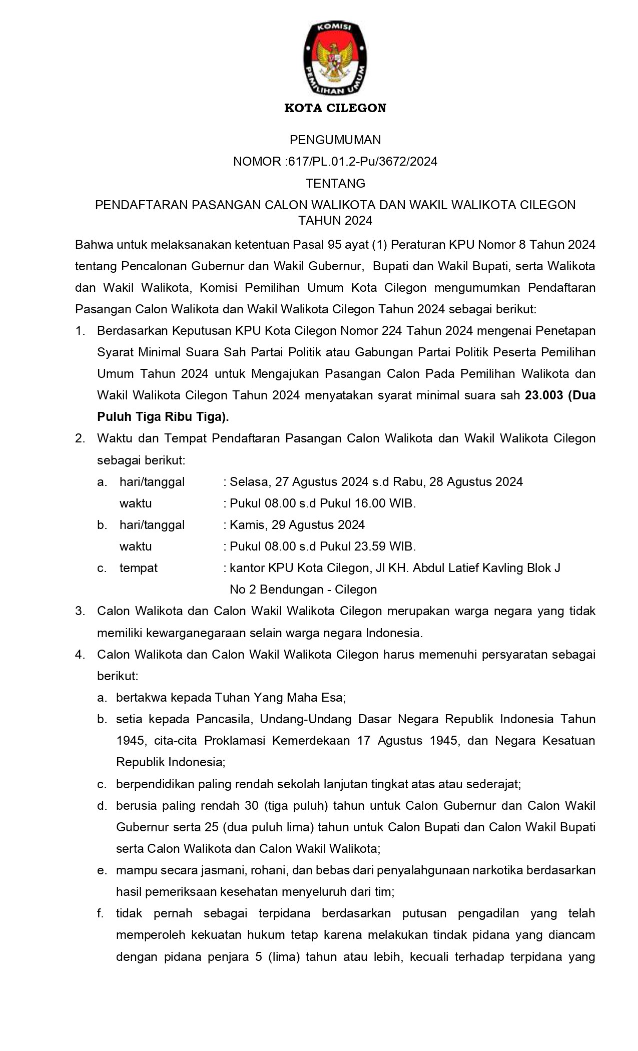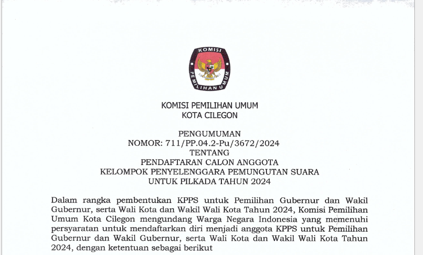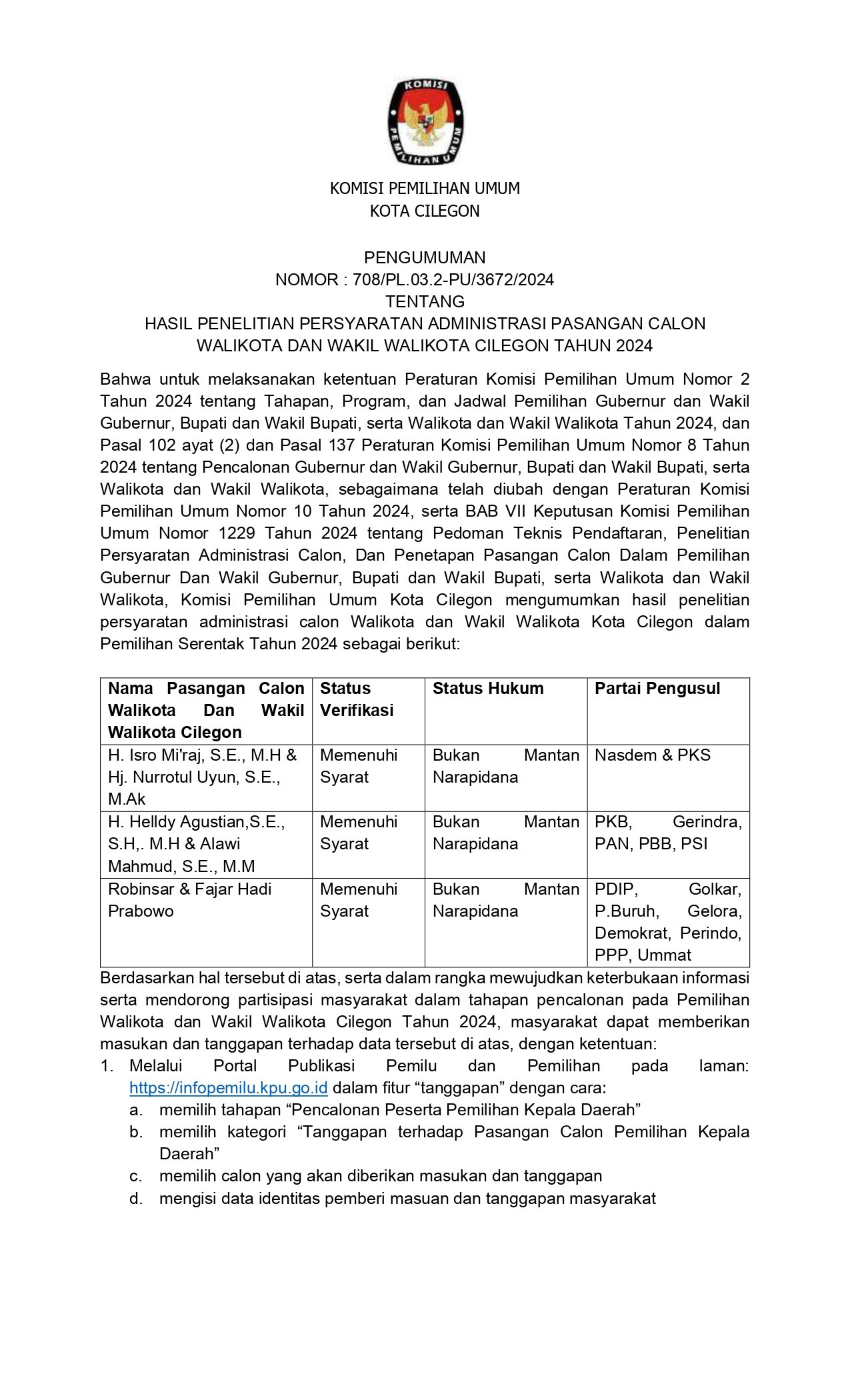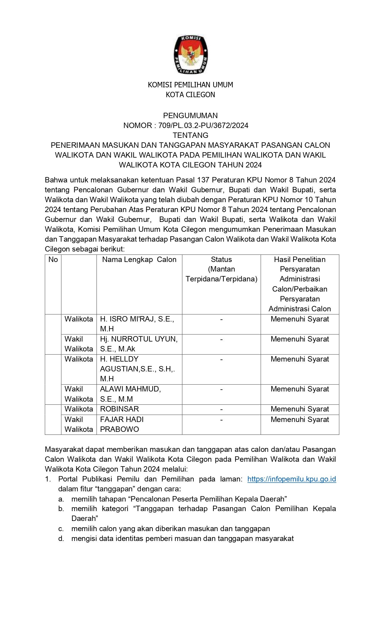 Bahwa untuk melaksanakan ketentuan Pasal 137 Peraturan KPU Nomor 8 Tahun 2024 tentang Pencalonan Gubernur dan Wakil Gubernur, Bupati dan Wakil Bupati, serta Walikota dan Wakil Walikota yang telah diubah dengan Peraturan KPU Nomor 10 Tahun 2024 tentang Perubahan Atas Peraturan KPU Nomor 8 Tahun 2024 tentang Pencalonan Gubernur dan Wakil Gubernur, Bupati dan Wakil Bupati, serta Walikota dan Wakil Walikota, Komisi Pemilihan Umum Kota Cilegon mengumumkan Penerimaan Masukan dan Tanggapan Masyarakat terhadap Pasangan Calon Walikota dan Wakil Walikota Kota Cilegon sebagai berikut: No Nama Lengkap Calon Status (Mantan Terpidana/Terpidana) Hasil Penelitian Persyaratan Administrasi Calon/Perbaikan Persyaratan Administrasi Calon Walikota H. ISRO MI'RAJ, S.E., M.H - Memenuhi Syarat Wakil Walikota Hj. NURROTUL UYUN, S.E., M.Ak - Memenuhi Syarat Walikota H. HELLDY AGUSTIAN,S.E., S.H,. M.H - Memenuhi Syarat Wakil Walikota ALAWI MAHMUD, S.E., M.M - Memenuhi Syarat Walikota ROBINSAR - Memenuhi Syarat Wakil Walikota FAJAR HADI PRABOWO - Memenuhi Syarat Informasi selengkapnya terkait penyampaian tanggapan masyarakat dapat dilaksanakan secara daring dan luring, informasi selengkapnya dapat klik link berikut : Penerimaan Masukan Dan Tanggapan Masyarakat Pasangan Calon Walikota Dan Wakil Walikota Pada Pemilihan Walikota Dan Wakil Walikota Kota Cilegon Tahun 2024 Adapun Visi dan Misi Bakal Calon Walikota dan Wakil Walikota Cilegon dapat diunduh pada link berikut : bit.ly/VISI_MISI_BakalCalonWalikotaDanWakilWalikota