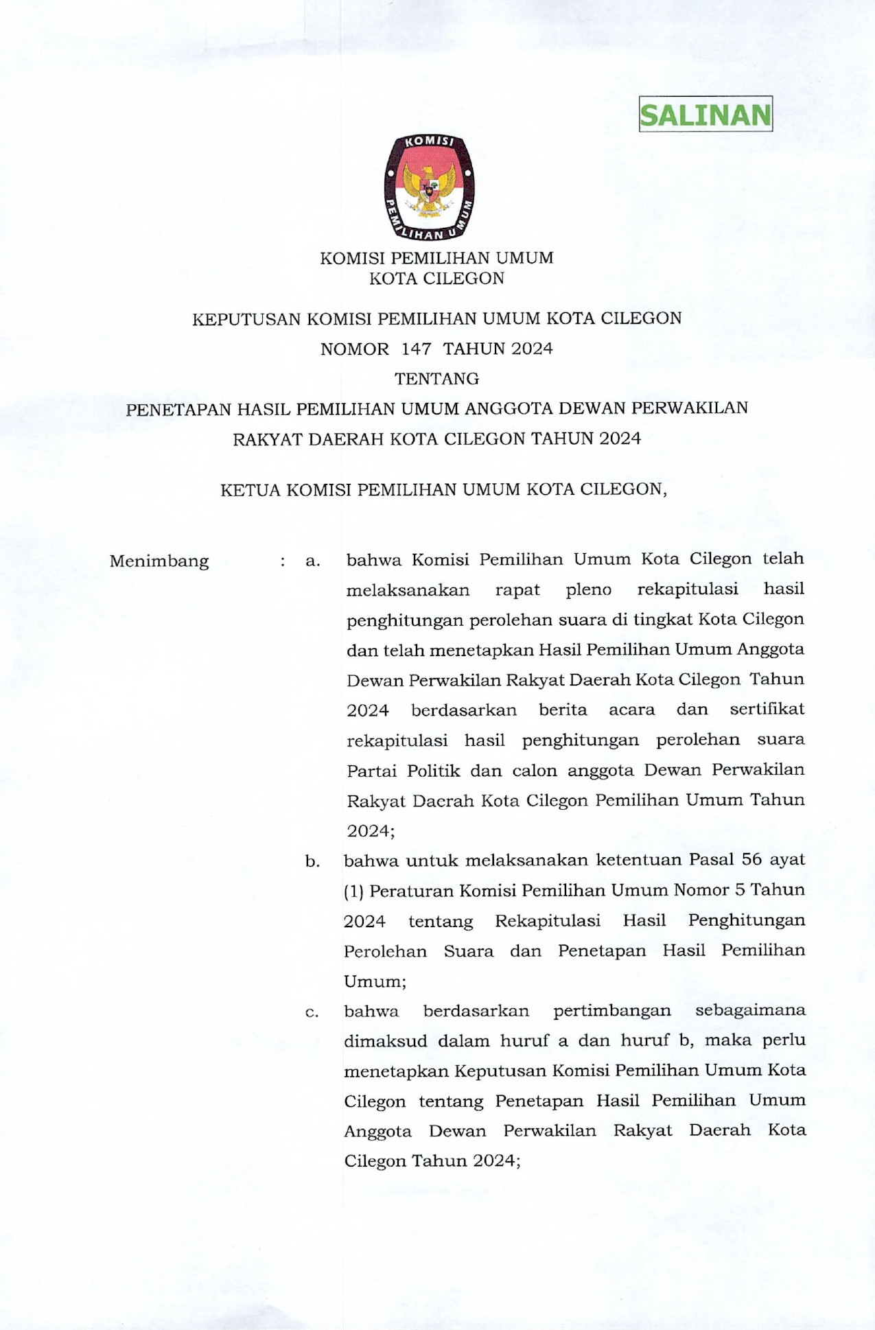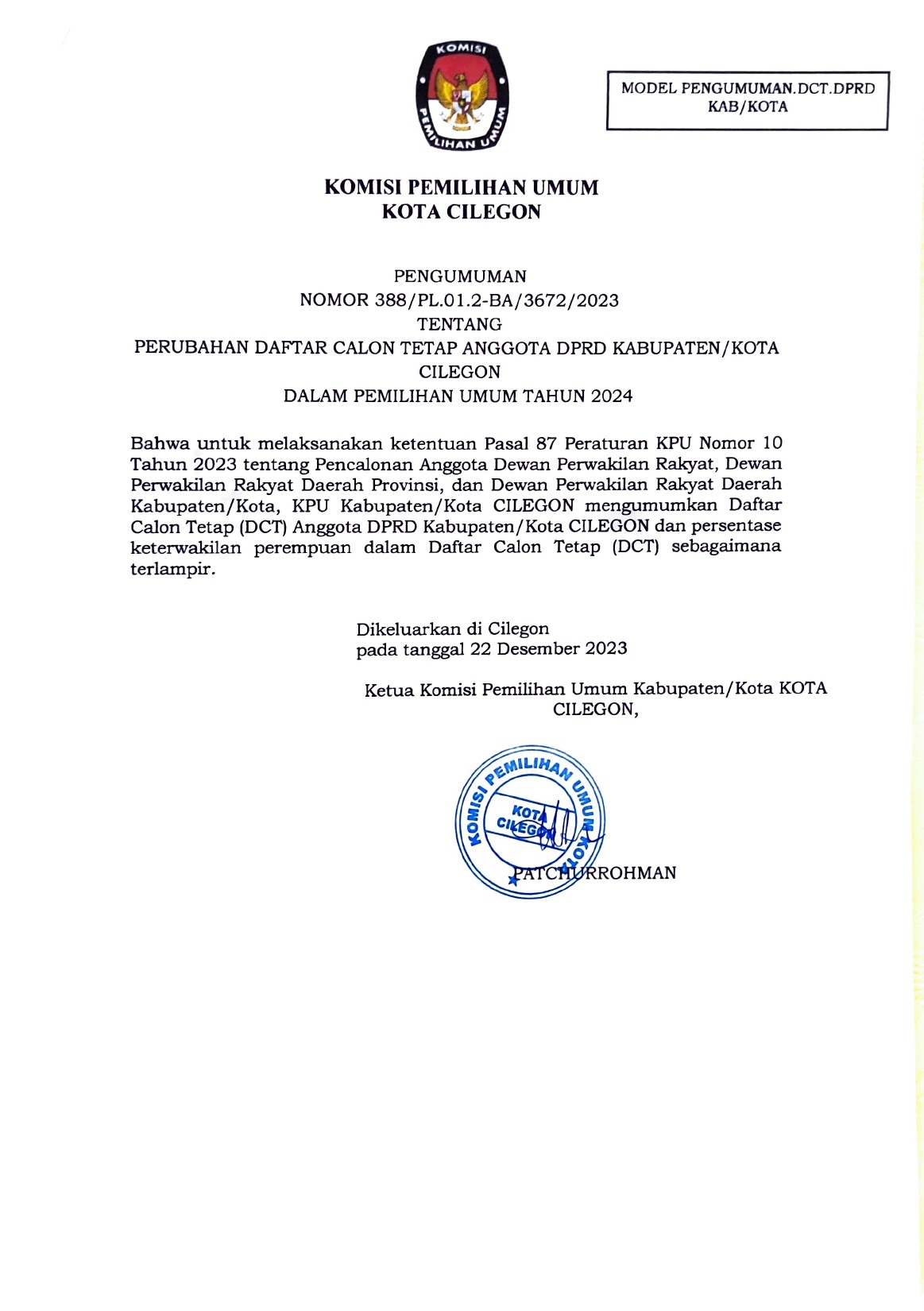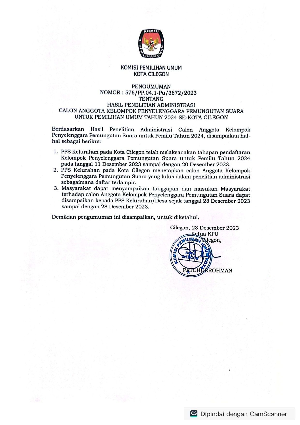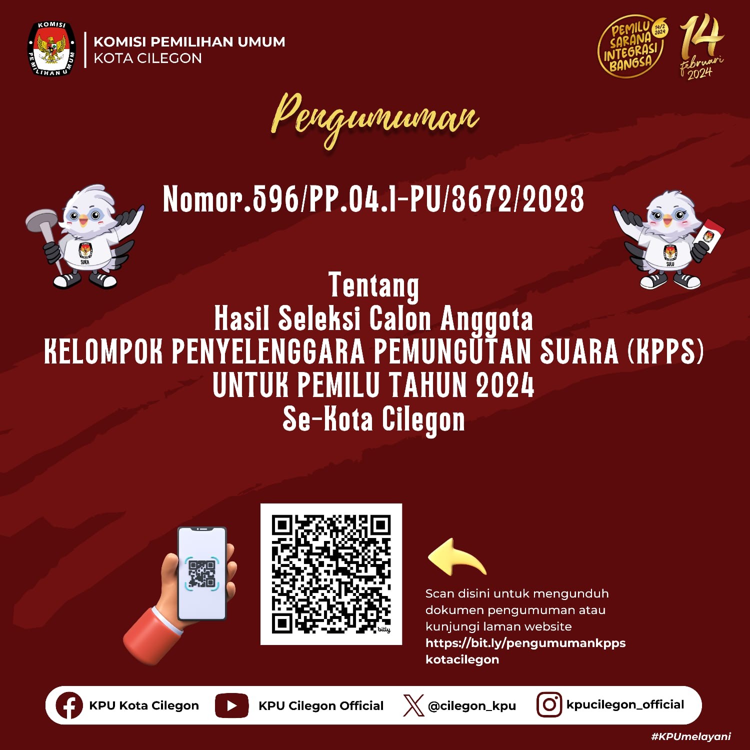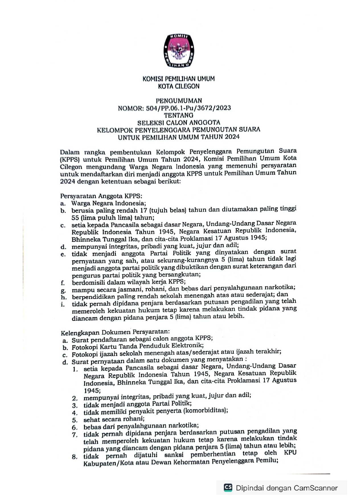 Dalam rangka pembentukan Kelompok Penyelenggara Pemungutan Suara (KPPS) untuk Pemilihan Umum Tahun 2024, Komisi Pemilihan Umum Kota Cilegon mengundang Warga Negara Indonesia yang memenuhi persyaratan untuk mendaftarkan diri menjadi anggota KPPS untuk Pemilihan Umum Tahun 2024 dengan ketentuan sebagai berikut: