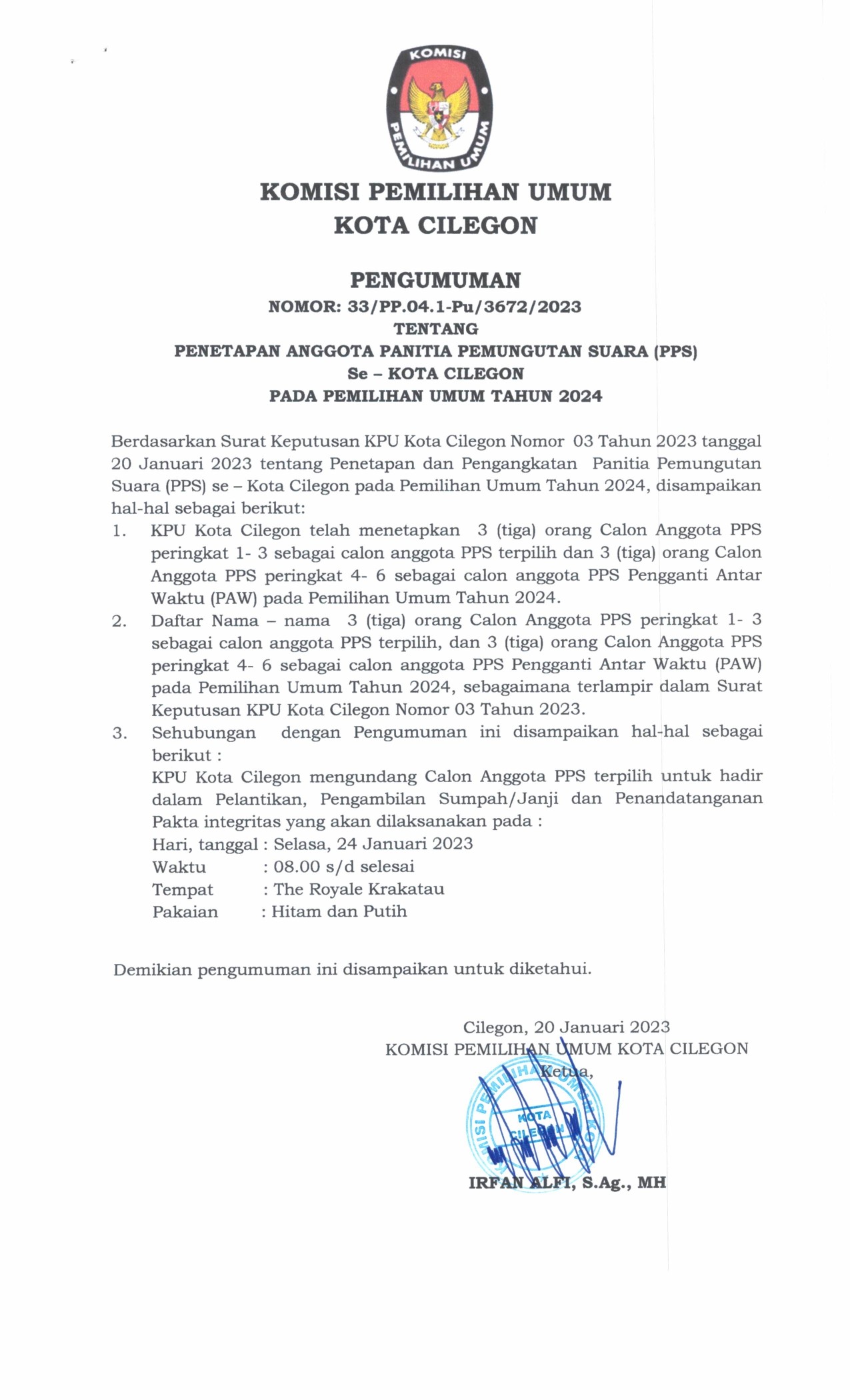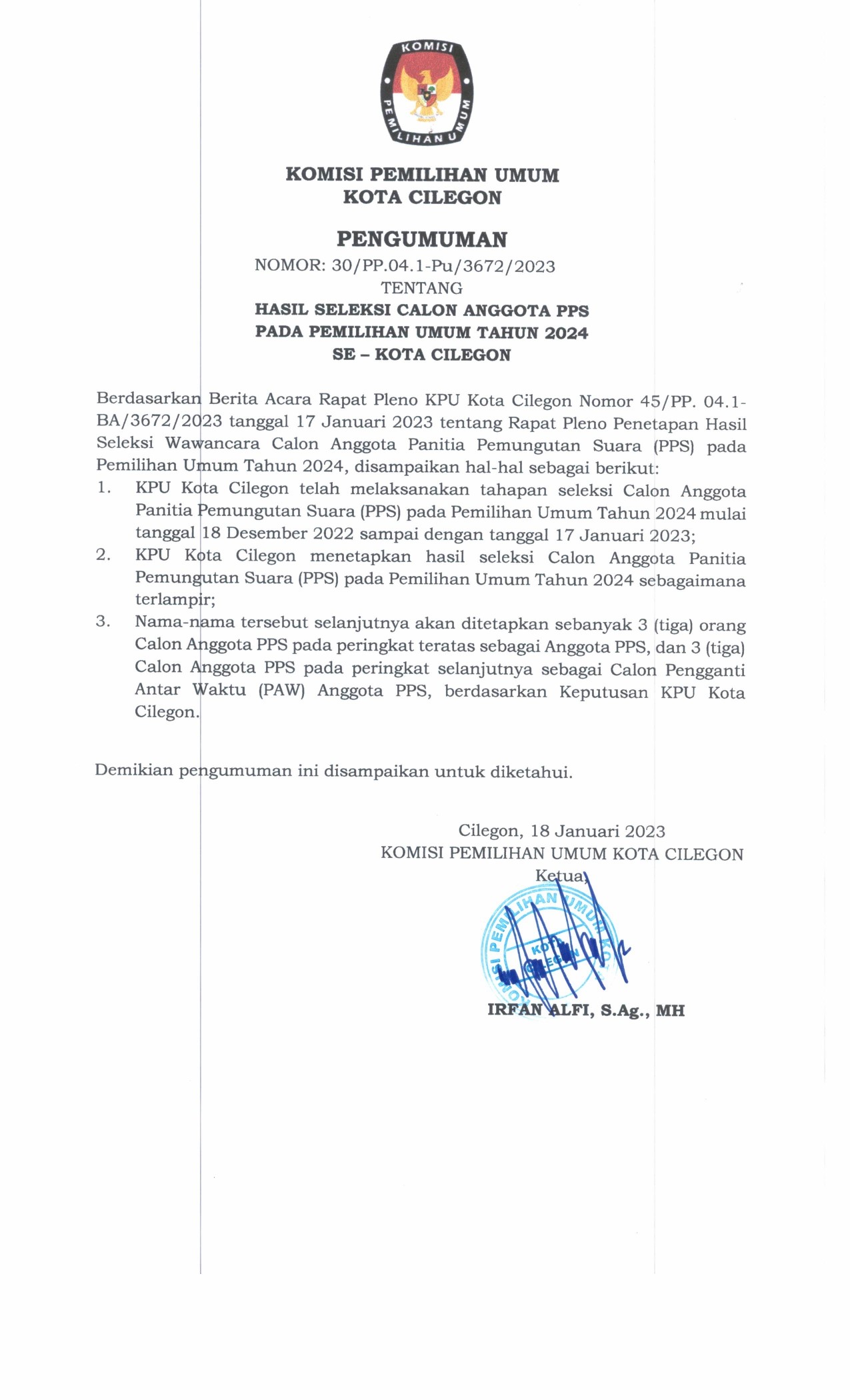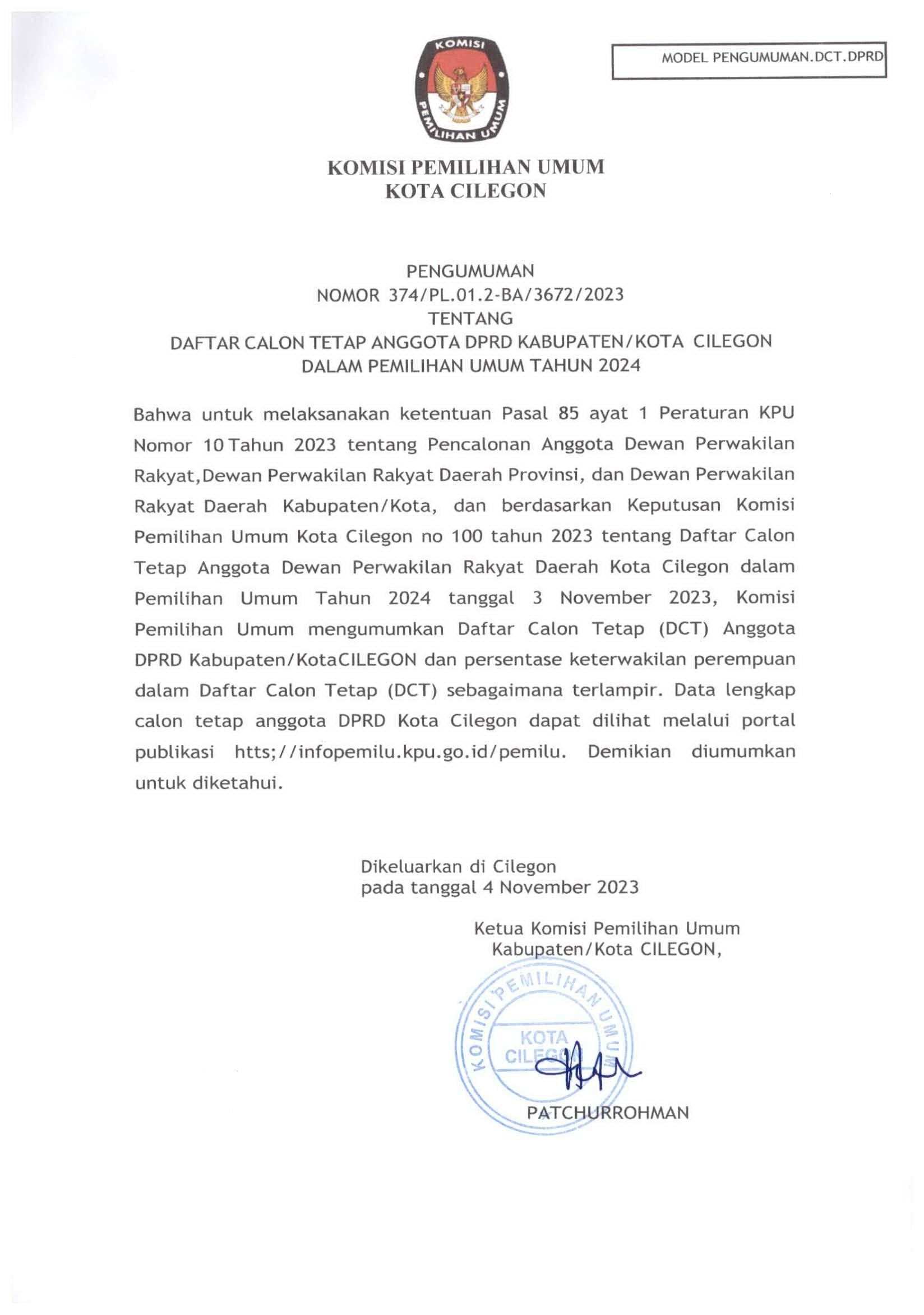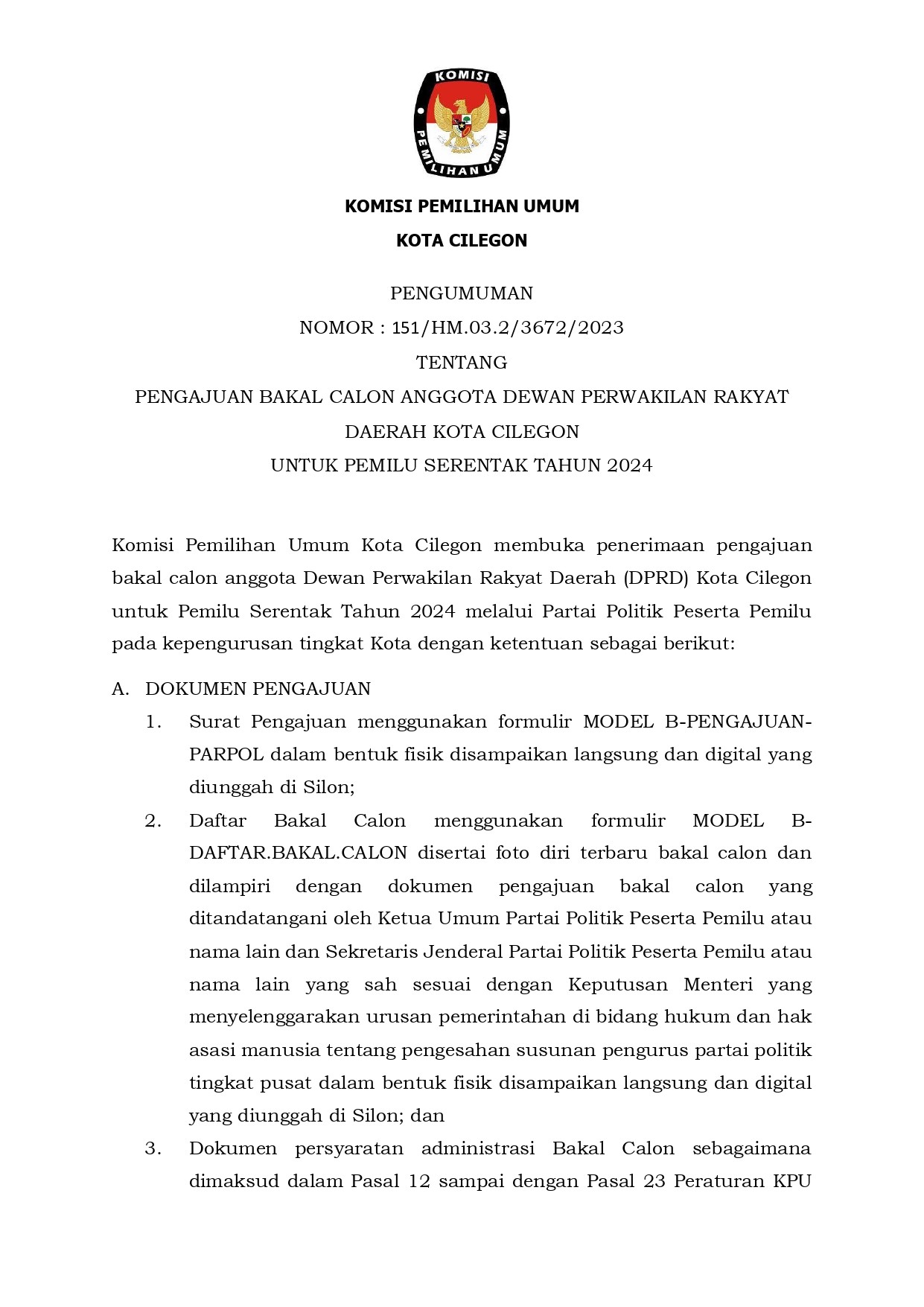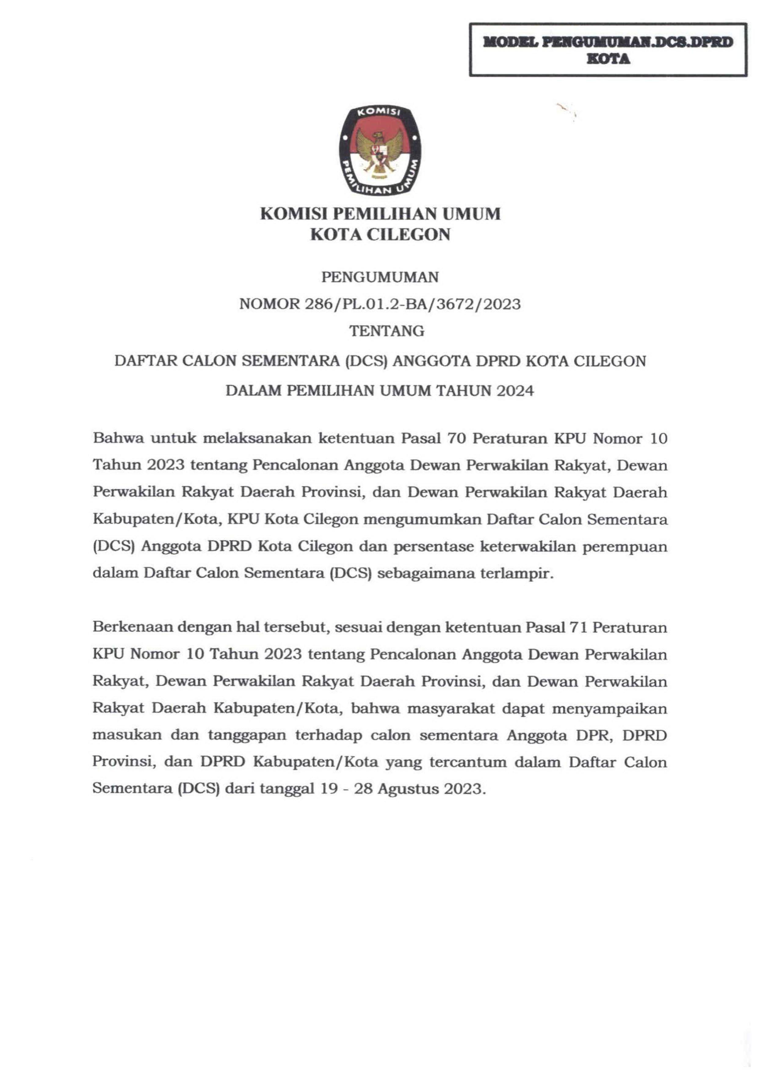 Bahwa untuk melaksanakan ketentuan Pasal 70 Peraturan KPU Nomor 10 Tahun 2023 tentang Pencalonan Anggota Dewan Perwakilan Rakyat, Dewan Perwakilan Rakyat Daerah Provinsi, dan Dewan Perwakilan Rakyat Daerah Kabupaten/Kota, KPU Kota Cilegon mengumumkan Daftar Calon Sementara (DCS) Anggota DPRD Kota Cilegon dan persentase keterwakilan perempuan dalam Daftar Calon Sementara (DCS) sebagaimana terlampir pada link bit.ly/DAFTAR_CALON_SEMENTARA.
