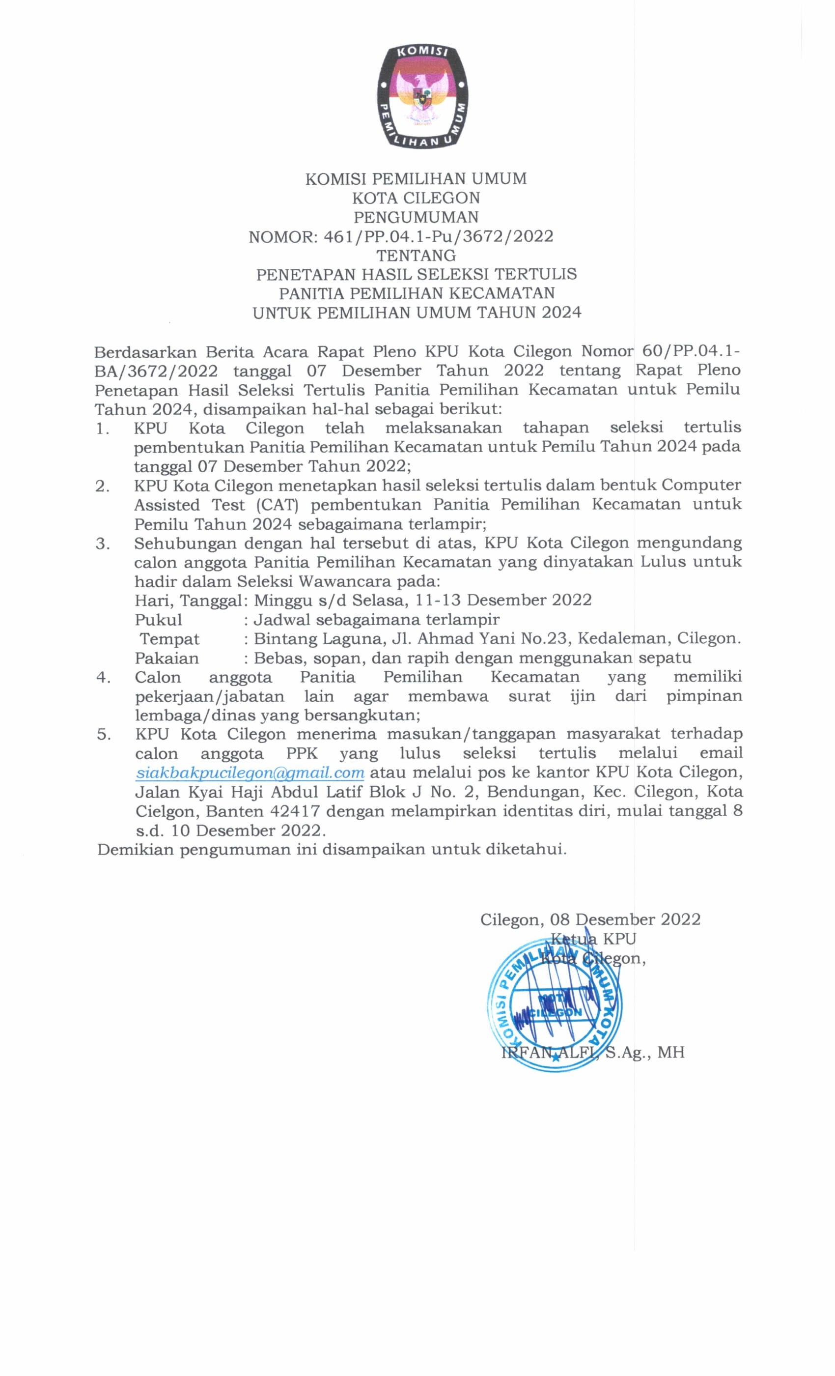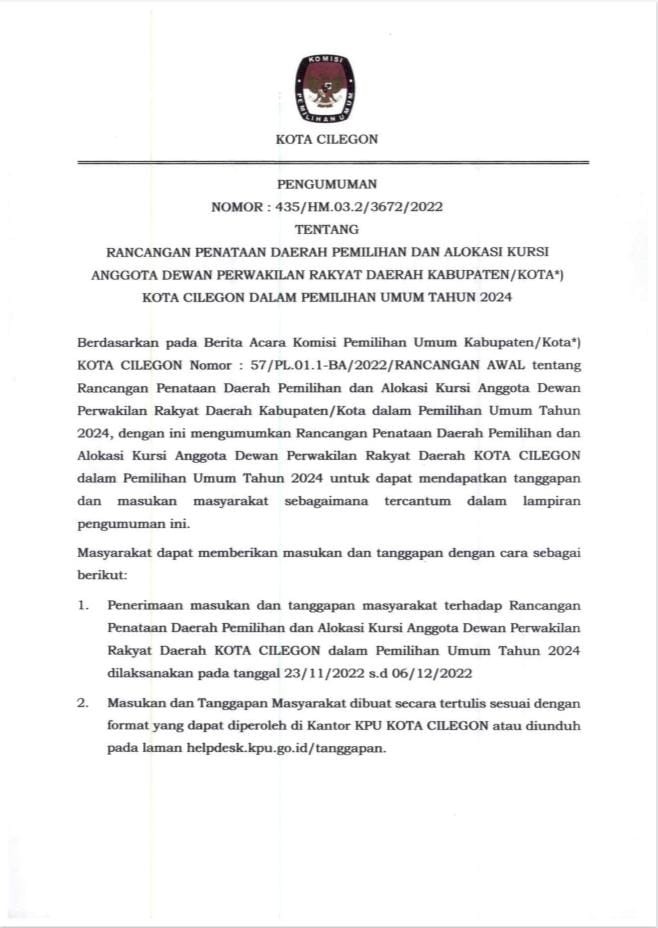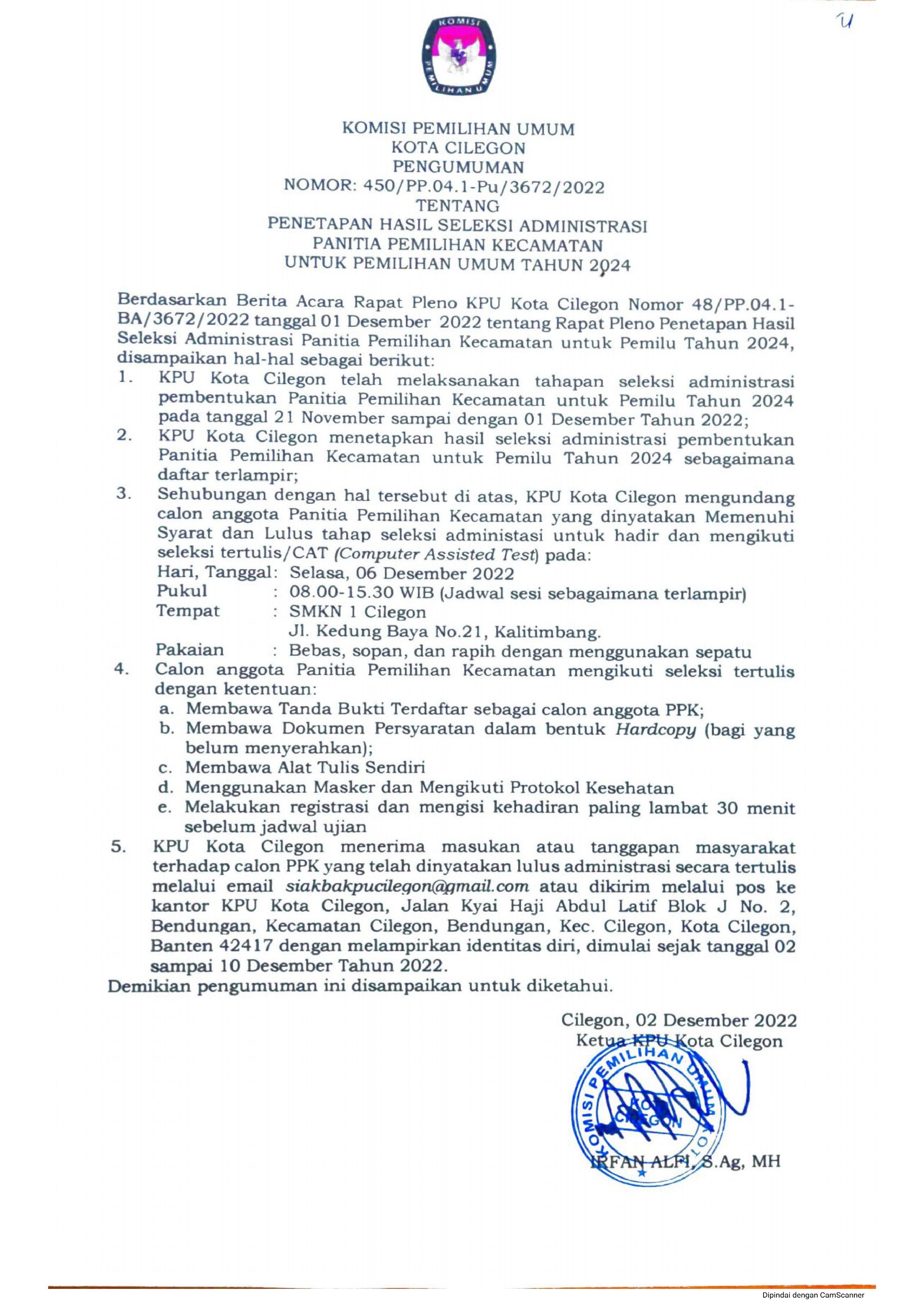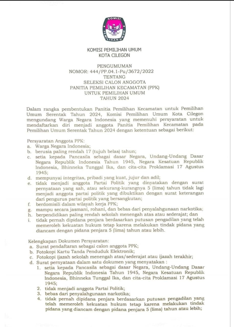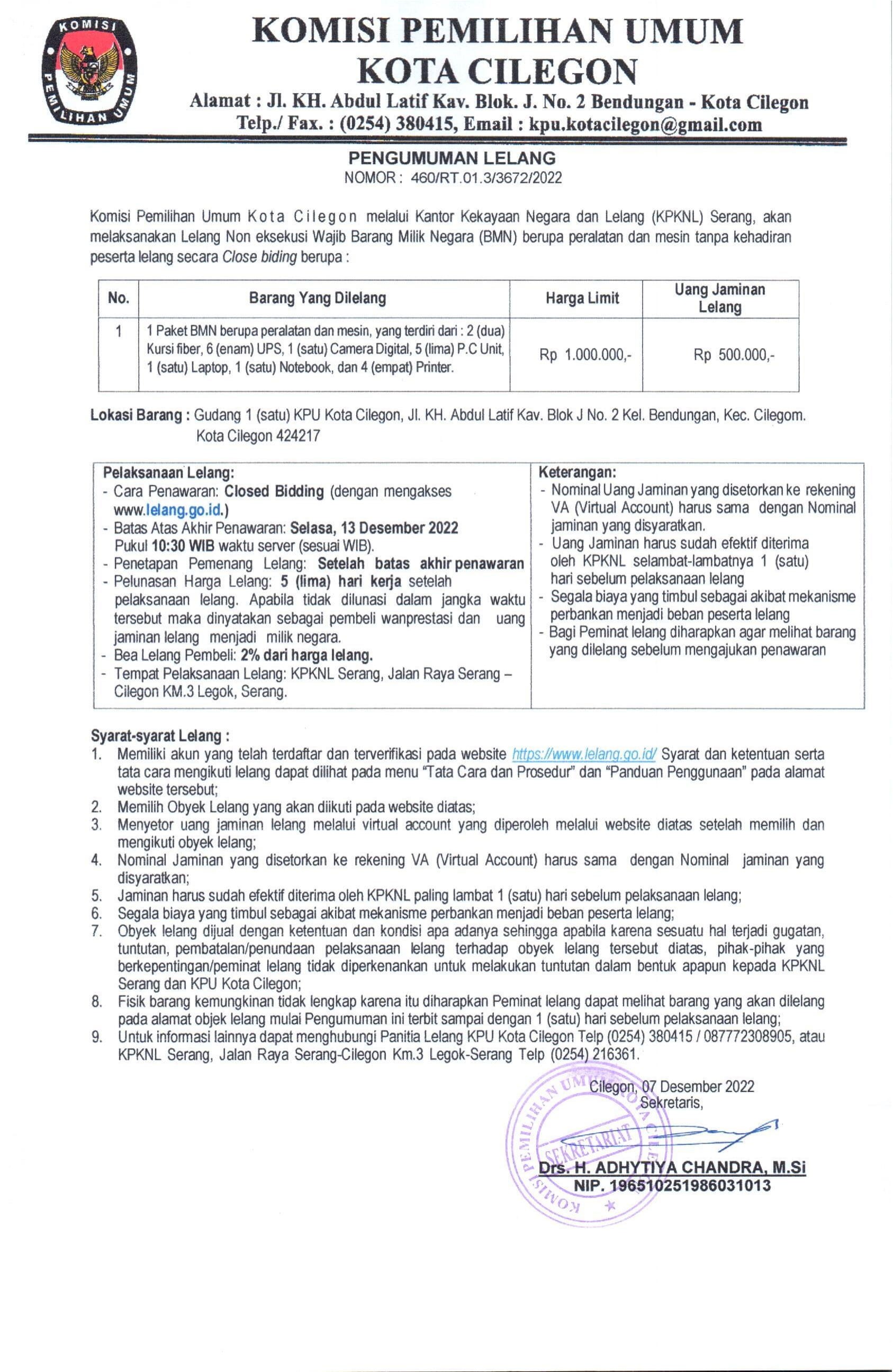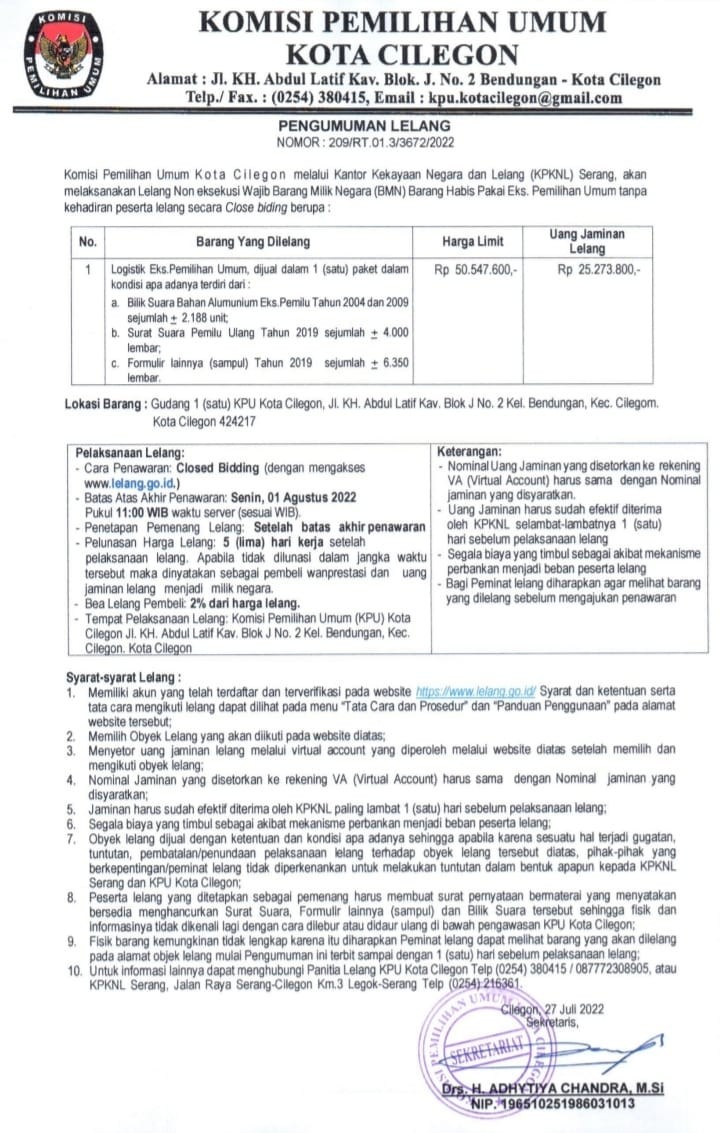 Komisi Pemilihan Umum Kota Cilegon melalui Kantor Kekayaan Negara dan Lelang (KPKNL) Serang, akan melaksanakan Lelang Non eksekusi Wajib Barang Milik Negara (BMN) berupa Peralatan dan Mesin. Adapun barang yang dilelang meliputi Kursi Fiber, UPS, Personal Computer, Laptop, Notebook, dan Printer. Lokasi Barang : Gudang 1 (satu) KPU Kota Cilegon, Jl. KH. Abdul Latif Kav. Blok J No. 2 Kel. Bendungan, Kec. Cilegon, Kota Cilegon 424217 Syarat-syarat Lelang : Memiliki akun yang telah terdaftar dan terverifikasi pada website https://lelang.go.id/ syarat dan ketentuan serta tata cara mengikuti lelang dapat dilihat pada menu “Tata Cara dan Prosedur” dan “Panduan Penggunaan” pada alamat website tersebut; Memilih Obyek Lelang yang akan diikuti pada website diatas; Menyetor uang jaminan lelang melalui virtual account yang diperoleh melalui website diatas setelah memilih dan mengikuti obyek lelang; Nominal Jaminan yang disetorkan ke rekening VA (Virtual Account) harus sama dengan Nominal jaminan yang disyaratkan; Jaminan harus sudah efektif diterima oleh KPKNL paling lambat 1 (satu) hari sebelum pelaksanaan lelang; Segala biaya yang timbul sebagai akibat mekanisme perbankan menjadi beban peserta lelang; Obyek lelang dijual dengan ketentuan dan kondisi apa adanya sehingga apabila karena sesuatu hal terjadi gugatan, tuntutan, pembatalan/penundaan pelaksanaan lelang terhadap obyek lelang tersebut diatas, pihak-pihak yang berkepentingan/peminat lelang tidak diperkenankan untuk melakukan tuntutan dalam bentuk apapun kepada KPKNL Serang dan KPU Kota Cilegon; Fisik barang kemungkinan tidak lengkap karena itu diharapkan Peminat lelang dapat melihat barang yang akan dilelang pada alamat objek lelang mulai Pengumuman ini terbit sampai dengan 1 (satu) hari sebelum pelaksanaan lelang; Untuk informasi lainnya dapat menghubungi Panitia Lelang KPU Kota Cilegon Telp (0254) 380415 / 087772308905, atau KPKNL Serang, Jalan Raya Serang-Cilegon Km.3 Legok-Serang Telp (0254) 216361. Untuk informasi lebih lanjut, dapat download Pengumuman Lelang di bawah ini : Pengumuman Lelang BMN Aset KPU Cilegon